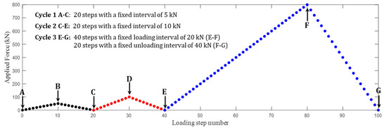 Each concrete sample was loaded in uniformly uniaxial presses by a YEW-5000F1 hydraulic pressure testing machine that contains a ball seat for leveling. Thus, the values of the applied forces and stresses hold a straightforward relationship, i.e., stress = force/contact area 15 × 15 cm2. Three loading-unloading cycles with a total of 100 steps were conducted, see Figure 2. For convenience of description, they are indicated by the characters encountered in alphabetical order. The applied forces firstly increased to 50 kN and then decreased back to 0 kN with a fixed step of 5 kN in cycle 1 (A–C). The second cycle (C–E) repeated this loading-unloading steps, but the interval was set as 10 kN. Finally, large stresses up to 800 kN were applied and released in cycle 3 (E–G).