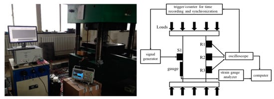 Ultrasonic transducer RS-2A with diameter 18.8 mm and thickness 15 mm had a broadband working frequency of 60~400 kHz. For each sample, 4 transducers, worked as a source (S1) and three receivers (R1-R3), were glued on its opposite sides using the coupling medium of high vacuum silicone grease. Figure 1b,c showed their location details. S1 and R2 were placed in the center of the left and right surfaces to collect data mainly corresponding to the horizontal effects, whereas the S1-R1 and S1-R3 pair observations contained both horizontal and vertical effects. In addition, 6 strain gauges were also installed around the transducers. The gauge measurements were accomplished with a DH3821 multichannel static strain test and analysis system, and their data were compared to the applied and estimated stress values in Section 4.