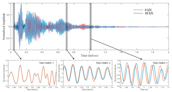 As shown in Figure 4, the compression extents in windows 2 and 3 have a little difference, implying dv/v values of coda waves depend on time [19,20]. For crack characterization, selecting appropriate time windows through trials, although cumbersome, is capable of improving the detection accuracy, such as the locations and depths of microcracks [8,9,10,11,12]. However, in real-life situations, the factors of composite, mixture, geometry, size, construction and corrosion contribute different uncertainties in concrete properties. Thus, it is impossible to set a universal time window suitable for all kinds of concretes and structures. As a result, dv/v-stress dependences are time-varying, which prevents coda waves (dv/v) as references for stress estimation applications.