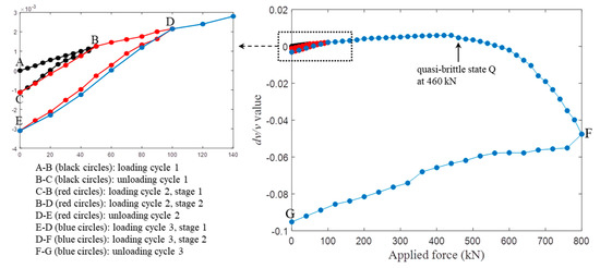 Figure 5 shows an example of the dv/v calculation values as a function of the applied stresses, corresponding to the C30-1 and R1 acquisitions. During stressing from the initial state A to the quasi-brittle state Q, the observations of the approximately linear stress-dv/v dependences are consistent with the acoustoelastic model in Equation (4). The slopes β are varied in some trends: (1) the velocity change dv/v at completely releasing states C and E is lower than the initial state A, i.e., dv/v values at state E < C < A. (2) The dv/v curves of the later loading cycles rise faster than the previous loading cycles, and they intersect at the historical maximum load. For example, the curves of the 2nd loading cycle (C-B), with the steeper slope, cross the 1st loading cycle (A-B) at its maximum load (50 kN). Similarly, the E-D curves cross the 2nd loading cycle C-D at a 100-kN load. (3) After the historical maximum loads, the curve climbs up from point B to D following the similar slope of the A-B curve, and the diagram from point E to D develops along the path that shows a similar slope to the C-B curve.
