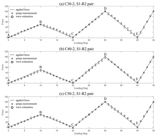 The applied (line), measured (x) and estimated (circle) stress values for the concrete samples of: (a) C30-2, (b) C40-2 and (c) C50-2.