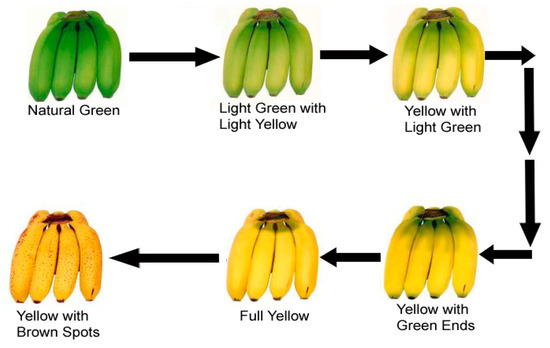 The ripening process brings a sequence of biochemical modifications that are responsible for the pigment formation, change of color, unpredictable smell, starch breakdown, abscission, and finally textural changes of banana [11]. During the stages of ripening, the peel color of banana changes from green to yellow and then a brownish color, as shown in Figure 1. The peel color of banana is the most used indicator to observe the quality by the consumer to decide the actual and consumption quality. During ripening, the firmness of banana decreases, which can also be used as a quality indicator. The tempering of banana mainly instigated by the enzyme activities in the cell wall involves polygalacturonase (PG), Pectate Lyase (PL), Pectin Methyl Esterase (PME), and cellulose, and activities of these enzymes are mainly ethylene dependent [17].