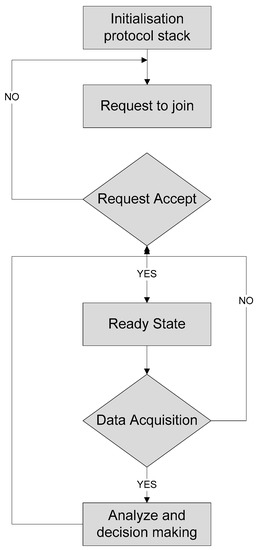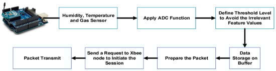 The micro-controller unit controls the operation of the end nodes and stores and deals with the collected feature data along with computational analysis. Figure 3 presents every process of the attached microcontroller that presents a vital task for data fusion in the Arduino board with the sensor and sending the sensor data to the coordinator.