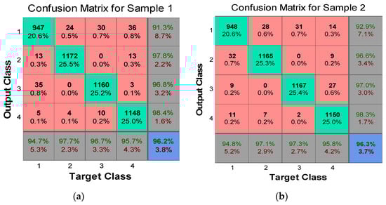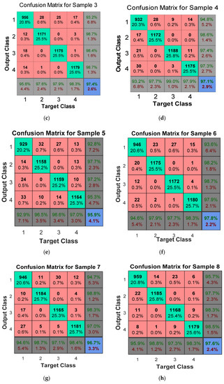 It can be easily being observed from Figure 14, each class has a maximum under 1200 testing trails in the green cells to show the accurate validation of datasets to observe the targeted output percentage. If we look at sample 1, a very low number of datasets are incorrectly classified as compared with the green cell. Target class 1 obtained 13 types of incorrectly classified sample trials in output class 2, 35 in class 3, and only 5 in target output class 4. Overall, 94.7 percent accuracy was achieved in the gray cell and a 5.3 percent error rate was identified, which shows the efficiency of the proposed architecture. All the targeted class aggregated output was calculated in the blue cell, which is 96.2% with only a 3.8% error rate, which is the satisfactory ratio. We can observe in sample 3, the cumulative accuracy percentage of all the test classes is 97.4% with only 2.6% error rate that are incorrectly classified as dataset trails within a reasonable processing time frame. This shows the proficiency in the proposed ANN method to decrease the amount of imprecision in analysis and validate the sample trained data.