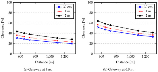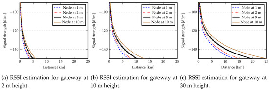 From the results shown in Figure 3 we can conclude that if a gateway is fixed at 30 m and a node is set to 10 m, then the maximum communication distance would be up to 25 km, which matches results presented in the literature (e.g., References [16,17,33]). However, the maximum distance is highly reduced for low heights.