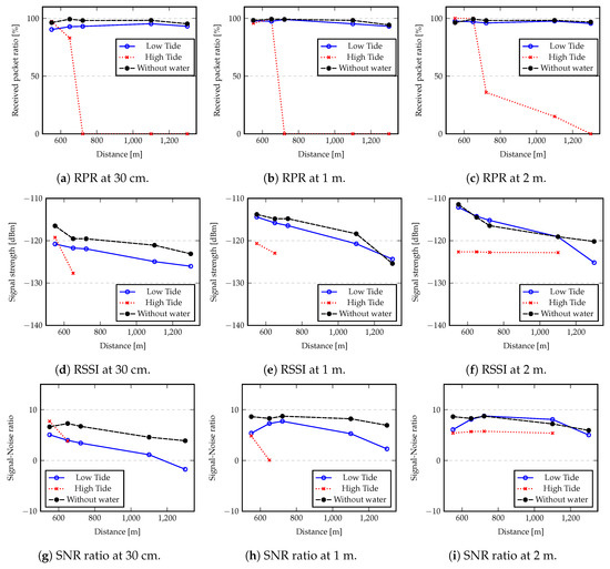 Li et al. report the application of LoRa in a sailing monitoring system [36] and Agbuya et al. describe the construction of a tidal monitoring system based on cloud services [37]. In these works the evaluation of network parameters is done taking into account the requirements of the application. In the first case, the transmitter is placed in a boat with the antenna 1.5 m above the water level. The authors report a coverage between 3 and 5 km depending on the spreading factor. In the second case, the most similar to our work, the LoRa transmitter is placed at a small height in a buoy. The results show a small range coverage of about 306 m. Our results show roughly the same behaviour at this height, but in addition we obtain results for a wider range of heights.