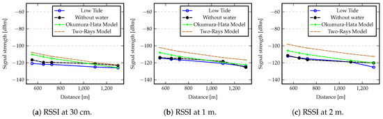 As mentioned, we consider that sensor nodes and their respective antennas must be located at low heights, close to the water but in the shore (without buoys or specific platforms like a boat). This represents a different perspective when compared to the work analysed above, in which antennas are deployed at higher positions, thus providing more cleared Fresnel zones [38] and increasing the communication range of LoRa. Concerning the work by Li et al. and by Agbuya et al. [36,37], floating platforms were used. Therefore, the antenna heights do not change with tides, and the variation of communication reliability over time is not investigated, as in this paper.
