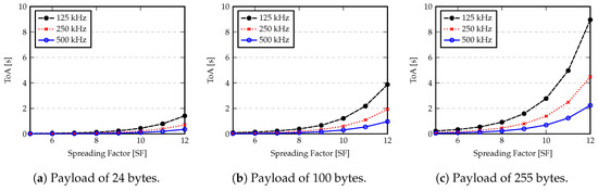 In order to demonstrate the influence of LoRa setting parameters, Figure 11 shows the ToA for different payload length (in bytes), using several combinations of bandwidth and spreading factors. These values are obtained by applying Equation (19).
