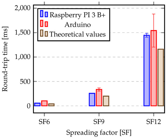 Table 6 shows the estimation ToA for a request with 20 Bytes and a response with 85 Bytes, considering three SF (SF6, SF9, SF12). As expected, the time needed to transmit a response is higher when compared to the request. Each response takes about three times more than a request. Table 6 also shows the round-trip time, obtained by the sum of ToA for a request and the ToA to receive the response. This round-trip-time is also represented in Figure 12.