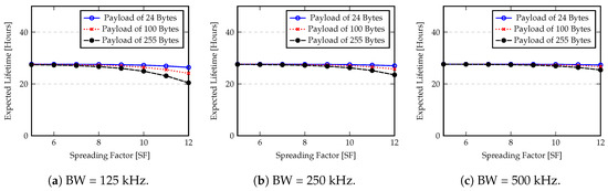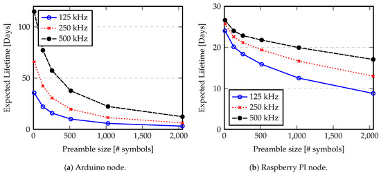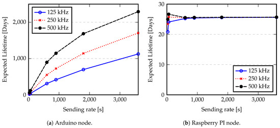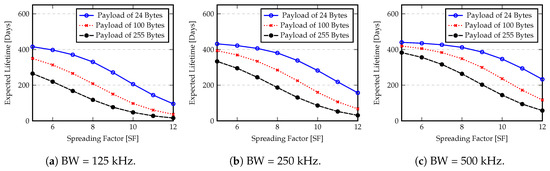 Figure 13 and Figure 14 show the expected battery lifetime obtained by Equation (17) for different bandwidth, spreading factor and payloads. For these computations we assume a of 6 symbols plus the mandatory sync word and start frame delimiter. The explicit header with the presence of CRC and DE, and a CR equal to 4 are also included. In terms of data sending rate, we assume that each sample is sent out every 60 s with the maximum transmission power (+14 dBm). The capacity of batteries are 4000 mAh and 1200 mAh for Raspberry PI and Arduino, respectively. A self-discharge rate of 2.5% per month is considered.