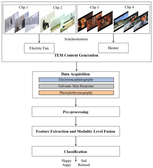 Our proposed methodology to classify human emotions using EEG, GSR, and PPG in response to TEM is shown in Figure 1. There are five phases including content generation, data acquisition, pre-processing, feature extraction and modality level fusion, and classification. Each of these phases is discussed in detail in the following subsections.