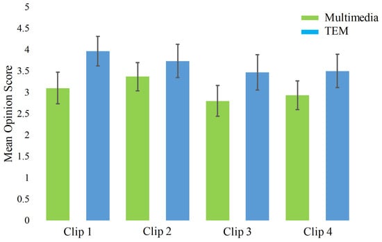 Confidence interval plot of MOS with confidence in response to traditional multimedia and TEM clips.