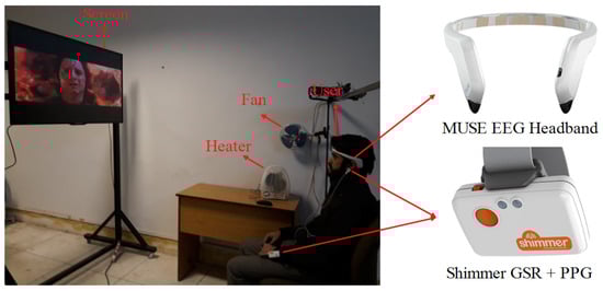 The data acquisition setup for experiencing TEM content along with the apparatus is shown in Figure 3. A commercially available EEG headband (Muse) was used for recording EEG signals, whereas a Shimmer GSR and PPG module was used for recording GSR and PPG signals. The Muse headband has two temporal (TP9 and TP10) and two frontal (AF7 and AF8) electrodes, which are designed to be placed according to the international 10–20 electrode positioning system. The GSR electrodes were placed on the hand finger, and PPG electrode was placed on the ear lobe. EEG, GSR, and PPG data were acquired at a sampling rate of 256 Hz.
