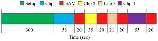 Each participant was initially briefed about the scope of the experiment. This was followed by signing of a written consent form and demographic details were recorded. The procedural diagram for data acquisition is shown in Figure 4. At the start of the experiment, wearable sensors were set up on an individual’s forehead, fingers, and ear lobe for EEG, GSR, and PPG data recording, respectively. Each TEM clip was then displayed to the participant on a 55 inch LED display. Each participant was provided with a comfortable chair to experience TEM clips in normal room temperature and lighting conditions. The viewer had to rate the clip on a 9-point SAM scale. SAM is a graphical (non-verbal) tool to measure the user’s affective reaction in response to a variety of stimuli in terms of valence, arousal, and dominance [93]. The valence dimension is represented graphically from smiling (happy) figure to frowning (unhappy) figure. Similarly, the arousal dimension is represented graphically from excited (wide-eyed) figure to relaxed (sleepy) figure. In this study, valence and arousal scores were recorded on a paper at the end of each clip (represented as red block in the sequence diagram). The valence value shows the pleasant-unpleasant state, whereas arousal represents the calm-excited state of an individual. In this study, Russell’s Circumplex model [7] was used to label emotions into four groups based on their valence arousal scores. Happy, angry, sad, and relaxed emotions were categorized based on high-valence high-arousal, low-valence high-arousal, low-valence low-arousal, and high-valence low-arousal groups, respectively.