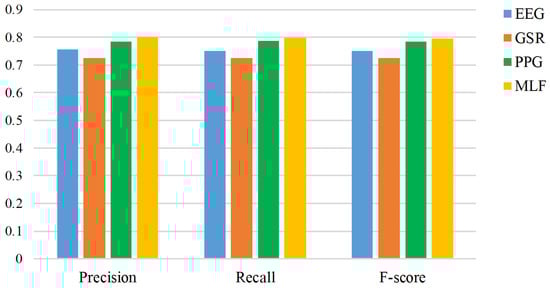 Precision, recall, and F-score in response to TEM using EEG, GSR, PPG, and MLF.