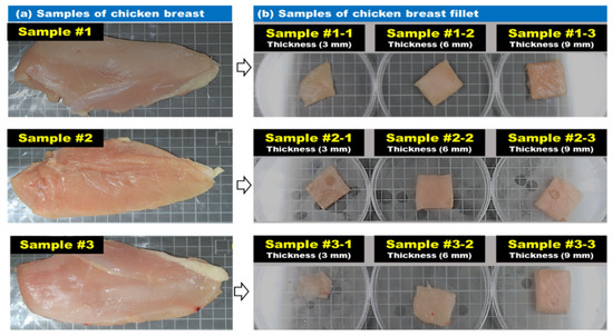 The meat used in this study was low in calories, delicate, and soft and had less fat than other meats. Chicken breast (FRESH-UP Gaseumsal, Harim, Iksan, Korea) with the bones removed was used. To facilitate cutting of chicken breast, the samples were stored frozen at −20 °C for 3 h. As shown in Figure 2, frozen chicken breast slices were prepared in 30 × 30-mm squares, and the fillet thicknesses were 3, 6, and 9-mm to obtain reflection spectra and images of chicken breasts of different thickness. A total of nine chicken breast samples were used.