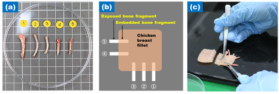 (a) 5 bone fragments; (b) Schematic diagram of exposed and embedded bone fragments to chicken breast fillet; (c) Setting bone fragments to chicken breast fillet.