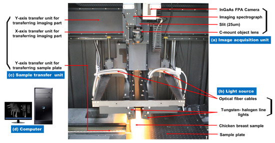 The SWIR hyperspectral reflectance imaging system equipped with (a) an image acquisition unit, (b) a light source, (c) a sample transfer unit, and (d) a computer.