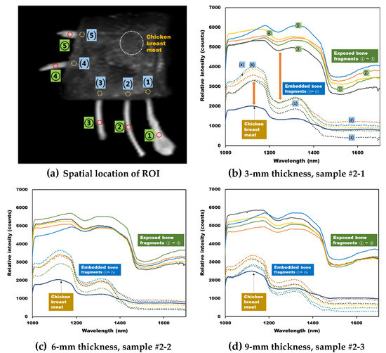 Table 2 shows the number of pixels (spectra) collected when the ROI for each part was extracted in a circular shape, as shown in Figure 6a. Therefore, the ROI pixels were collected from 5 exposed bone fragments, 5 embedded bone fragments, and 1 chicken breast meat for each of the 3 samples. The ROI pixels extracted from the exposed bone fragments were collected from a minimum of 16 pixels to a maximum of 36 pixels for each bone fragment thickness. The ROI extraction location of the embedded bone fragments under the chicken breast meat was roughly estimated and collected. The ROI range of chicken breast was extracted in a relatively wider region rather than the sum of the 5 exposed bone fragments, and a minimum 187 pixels to a maximum of 209 pixels were collected.