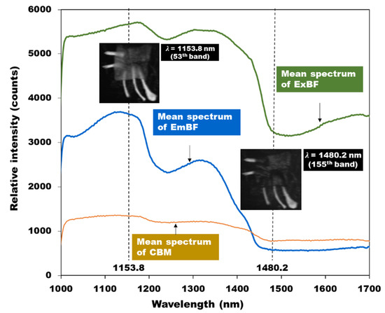 Two wavelength bands were selected to detect bone fragments embedded in the chicken breast fillets. The subtraction image was produced using the wavelength representing the highest and the lowest reflection intensity in the region of the bone fragment. Based on the spectral curves in Figure 8, the two wavelength bands of 1153.8-nm (53rd band) and 1480.2-nm (155th band) could be potential candidates for discriminating EmBF in chicken breast fillets.
