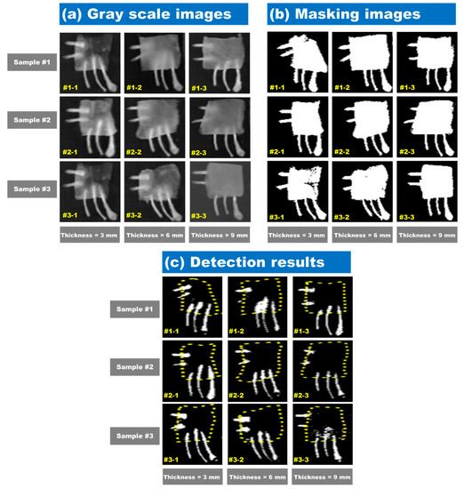 A subtraction image algorithm was used to identify the minimal change between images of EmBF and CBM. The pixel values of ROI were extracted from subtraction images formed by 1153.8-nm and 1480.2-nm band images. Next, the threshold value for distinguishing the bone fragment was determined to be 2000, and this threshold was applied to the subtraction image model. Figure 9 shows the result of confirming the detection of foreign materials by applying the subtraction image model obtained above to all pixels of the hyperspectral image. Figure 9a shows a gray scale image with a subtraction algorithm. The binary masks of the chicken breast fillets are illustrated in Figure 9b. For removing the background, a threshold of (2200) was applied, and we multiplied the binary image with the subtraction image. Figure 9c shows the final result for the detection of bone fragments and chicken breast fillets by checking the threshold of the subtraction image algorithm. The yellow dashed line indicates the chicken breast fillet position. As shown in Figure 9c, for sample 1 with a thickness of 6-mm, No. 2 and No. 3 EmBF were easily detected against the No 4 sample. In addition, in the case of sample 3 with a thickness of 9-mm, the exposed areas of the No 4 and No 5 samples of the bone fragments were clearly visible, whereas the detection of the EmBF was not perfect. It was validated that the bone fragments were mostly detected, and the success score of detecting bone fragments using the subtraction image algorithm was 93.3%.