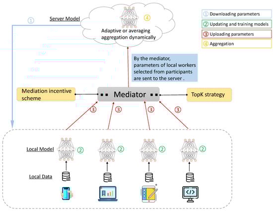 Recent years have witnessed the advent of federated learning technique alongside the challenges and threats [10,11]. Through training language models cooperatively on mobile devices instead of uploading data to the server and learning from distributed models, FL lessens the high data transferring cost and privacy risk [12]. Generally speaking, FL is mainly composed of three phases. In the first phase, the global server initializes model parameters and then device workers download the model. Secondly, each worker trains the model on its local data independently. In the third phase, all local trained models are uploaded to the server via a secure protocol tunnel and aggregated for a global model. The process consisting of three phases can be iterated a great number of rounds until the global model converges or the threshold level is achieved. Even with this efficient training pattern, a crucial issue is the gigantic communication overhead generated from the model parameters exchange [13,14]. As of writing, federated learning has three researching domains: optimization design, communication efficiency, and security algorithm. To deal with aggregation and communication cost issues, we propose a novel framework, namely Federated Mediation (FedMed), as is illustrated in Figure 1.