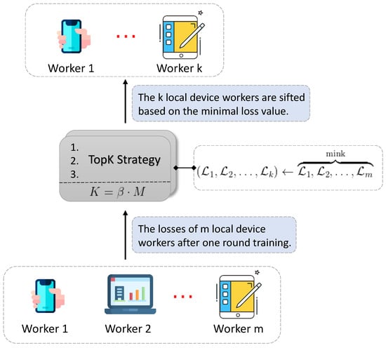 In Equation (8), the process of computation is subject to two key parameters: , one hyperparameter to represent the fraction of workers to be selected; and , the number of training workers upon each round. Note the is in the range , where bound 0.0 and 1.0 represent, respectively, totally negligible and whole workers. We also take as one hyperparameter in the FedMed. In Equation (9), the right part indicates that the minimum losses are sifted from the total losses set, and the correlative workers are indexed and authorized for subsequent model transferring. In conclusion, we introduce the topK strategy into the federated learning for the first time, towards the objective of communication efficiency and effective features learning through the optimum models sifting.