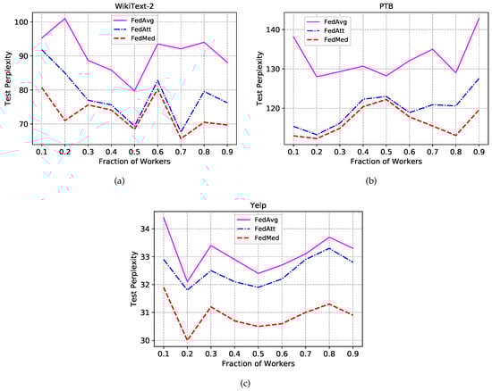The FedMed approach renders a performance boost in all three datasets in all fraction settings, even though it reports a weak advantage over FedAtt when in WikiText-2. Test perplexity does not show discernible trends regularity when fraction C varies from 0.1 to 0.9. It also does not report that fewer or more workers can make a contribution to high performance. However, the language model comparatively obtains the best perplexity on the setting of fraction . Meanwhile, it can be found that the divergence between the FedMed and the FedAtt is much bigger than the one between the FedAtt and the FedAvg on Yelp dataset, which represents that our FedMed approach achieves more remarkable performance than the two baselines. Concerning the embedding space of Yelp larger than the other two, it can be explained that FedMed provides a considerable generalization while the FedAtt deteriorates a little in terms of generalization on the large dataset. Statistically, we can spot substantial gains: FedMed takes the definite advantage in all three datasets compared to the other two methods.