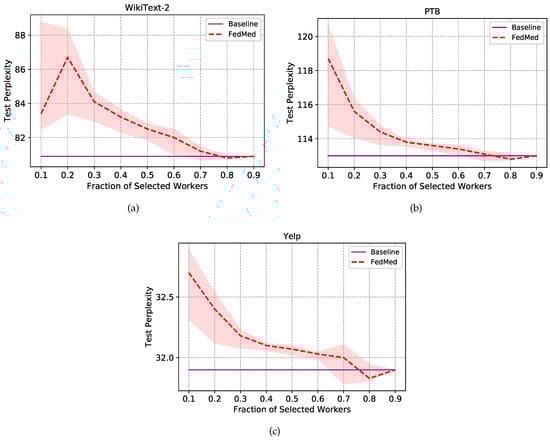 For the model evaluation simplification, experiments are conducted under the setting of fraction , and other settings are similar to the prior, and topK strategy can get comparable results under different fraction C conditions. As is shown in Figure 5, our proposed method obtains considerable improvements in efficiency with less communication cost among all three datasets. To be specific, results on all three datasets can be found that the PPL has a trend of decreasing gradually, which denotes that the server model has better performance, along with more workers selected basically. We can find that the model with topK strategy gets the lowest perplexity on , which represents 80% of high-level worker parameters are sifted to upload to the server, and 20% of ones are discarded. What can be seen is that it does not weaken the server model to learn features and predict words. Not only does the method save 20% of communication costs but it gives a little boost for the server’s performance. Using our method, we can conclude that the mediator of FedMed selects high-quality worker models and drops inferior worker models. Hence, the server can get rid of the noise of abnormal data and boost the model’s robustness. Furthermore, when fraction is 0.5, the test PPL is closer to the purple guideline. That is to say, results are only 0.53%, 1.93%, and 0.54% higher than baselines in WikiText-2, PTB, and Yelp datasets respectively. Nevertheless, the FedMed with topK strategy saves 50% of communication costs, which demonstrates significant boost to the communication efficiency in federated learning.