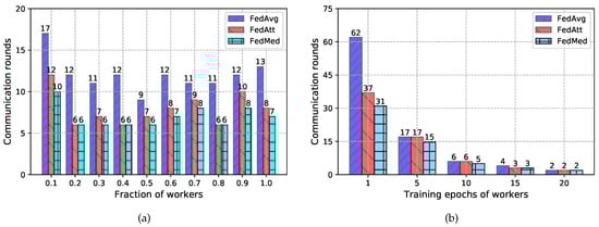 Experiment is first conducted with the 50 round of communication and different worker fraction C stands for the size of local workers in parallelism, i.e., indicates there are ten workers training for federated learning. In realistic application scenarios, not all devices are continuously online because of power supply or network breakdown. Hence, it is critical and significant to evaluate the performance of disparate number of workers through altering the fraction C. Figure 4 shows the effect of varying C for different methods(i.e., FedAvg, FedAtt, FedMed).