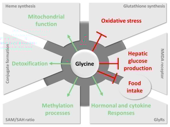 As the smallest and the only non-chiral AA, glycine presents a unique structure that is irreplaceable in the framework construction of many structural proteins (e.g., collagen fibril and elastin [16]) and common metabolites (e.g., glutathione, creatine, porphyrins, purines, heme, and serine [3]) as well as in the provision of the flexibility necessary for conformational changes in the active sites of some particular enzymes [17]. Consequently, glycine is involved in multiple physiological processes that are related to three crucial functions: cytoprotection, anti-inflammatory responses, as well as body growth and development [3].