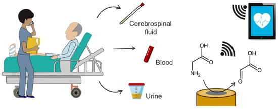 The current gold standard analytical approach for glycine detection in the clinical field involves sample extraction (usually blood and/or urine) and chromatographic or fluorometric analyses in centralized laboratories, which results in long delays in results provision as well as considerable economical costs. Consequently, there is a clear need for the development of reliable point-of-care (POC) glycine detection methods able to provide real-time information related to a patient’s health status. In this context, this review focuses on the electrochemical detection of glycine as a strategy that can easily be implemented in POC devices, specifically considering biosensors (Figure 2). The first section of this review focuses on the different body fluids where glycine determination is clinically relevant, reviewing glycine levels and the information about health disorders that can be acquired from each targeted body fluid. Subsequently, the different electrochemical strategies reported up to now for glycine determination are critically discussed, with particular emphasis on their suitability for glycine quantification at the POC level. Finally, electrochemical biosensing is discussed as a potential alternative that can help toward overcoming some of the analytical drawbacks that are currently impeding the establishment of POC glycine platforms.