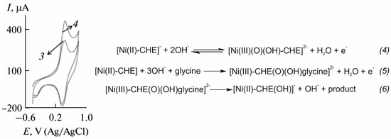 Reactions involved in the determination of glycine using a Ni(II) chelidamic acid-modified electrode with the expected cyclic voltammograms in the absence (reaction 4, curve 3) and presence (reactions 5 and 6, curve 4) of glycine. (The plot for the voltammograms on the left is reproduced from reference [61] with permission from Springer, Copyright 2020).
