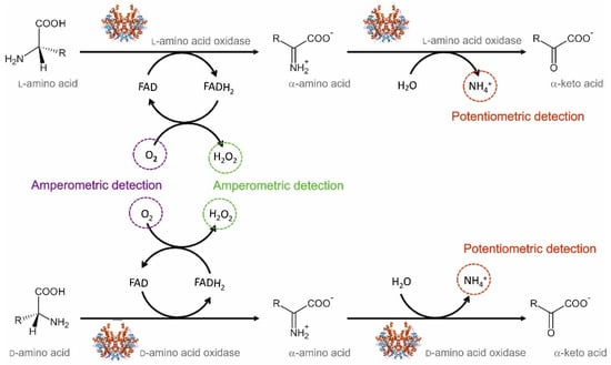 Another strategy that allows the amperometric determination of peroxide hydrogen is based on a bienzymatic configuration, where horseradish peroxidase (HRP, EC 1.11.1.7) catalyzes the reduction in peroxide hydrogen. This scheme was reported by Domínguez et al. [91], who tested this bienzymatic configuration for both l-AA and d-AA by modifying composite graphite–Teflon electrodes with HRP and either LAAO or DAAO. The reduction in peroxide hydrogen was mediated by ferrocene. These biosensors were individually tested for different l- and d-AAs, achieving LODs in the range of 1–200 µM depending on the considered AA. In general, lower sensitivities were observed for polar AAs, which authors attributed to the hydrophobic nature of the Teflon present on the surface. Both biosensors were able to correctly discriminate enantiomers in racemic samples but were unable to distinguish between different AAs.