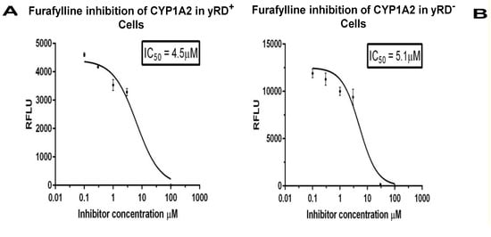Alpha-naphthoflavone (ANF) is known to inhibit both CYP1A1 and CYP1B1 enzymes, as well as furafylline, a known inhibitor of CYP1A2. These were used for the IC50 determination studies (Figure 5A,B, Figure 6A,B, and Figure 7A,B). Western blotting (Figure 5C, Figure 6C and Figure 7C) was performed to confirm the expression of CYPs, driven by ADH2p, and Bax, driven by GAL1p, within yeast cells that lacked CPR activity. The presence of both a CYP and Bax further supported the notion that Bax indeed was responsible for the CYP activation. Although CYP-expressing yRD− strains had CYP proteins as much as the cells that expressed CYPs in yRD+ and yRD− strains, the protein was not active because of the absence of the P450 reductase (i.e., CPR).