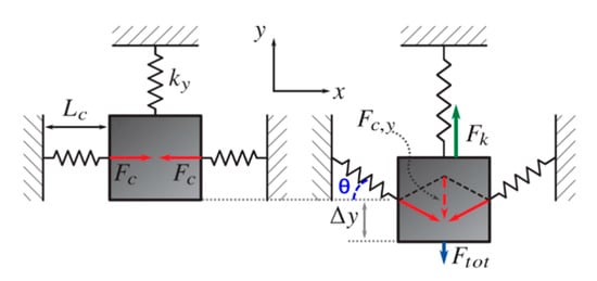 In gravitational wave detectors, GAS technology is used to reduce the resonance frequency of a large seismic isolation filter, which reduces the attenuation of the gravitational wave signal by external seismic activity by a factor of about 1012 [,]. A similar principle can be used for MEMS accelerometers, for which the GAS typically consists of a set of curved, pre-stressed springs attached to the proof mass. The springs can be compressed or loaded passively with a force, due to earth gravity, or actively with a dedicated actuation system. The compression of the springs effectively decreases the resonance frequency along the axis of the sensitivity of the mass-spring system, which significantly increases the sensitivity of the accelerometer. As shown in Figure 2, a proof mass is connected to a spring in the y-direction of stiffness ky and two springs forming the GAS in the x-direction of stiffness kc, which is pre-loaded with a force Fc in the direction orthogonal to the sensing direction and compressed to a length Lc. The system is in equilibrium since the compression forces Fc cancel each other out.