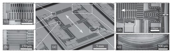SEM images of MEMS accelerometer developed by Boom and Kamp et al. at Nikhef and University of Twente [,]: (a) entire sensor chip, (b) sense comb fingers, (c) actuation electrodes, (d) preloading mechanisms, (e) one of the suspension spring sets in a compressed state.