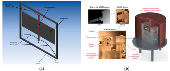 Schematic diagrams of MEMS accelerometer and experimental setup developed by Middlemiss et al. at University of Glasgow []: (a) schematic diagram of the MEMS accelerometer—central proof mass was suspended from three flexures: an anti-spring pair at the bottom and a curved cantilever at the top; (b) experimental setup. (Figure 4a is redrew by the authors)