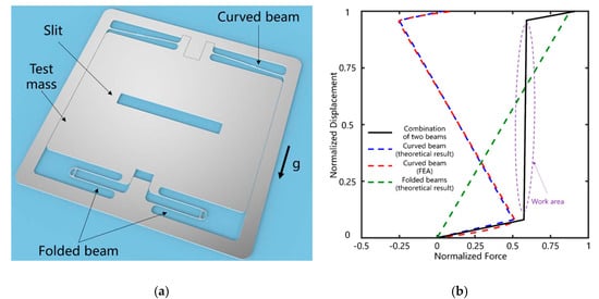 Schematic diagram of the MEMS accelerometer with a novel quasi-zero stiffness suspension developed by Tang et al. at Huazhong University of Science and Technology and its spring constant []: (a) schematic diagram of the MEMS mechanism; (b) normalized force-displacement curve of different spring designs.