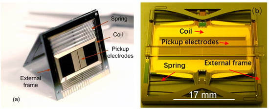 High-resolution accelerometers are required for many specific application areas, including inertial navigation, earthquake detection, spacecraft guidance or stabilization, geophysical sensing, etc. The history of high-resolution accelerometers dates back to the 1960s, when they were used in space environment exploration missions. In the early 1970s, the Office National d’Etudes et de Recherches Aérospatiales (ONERA, France) developed an electrostatic accelerometer termed Capteur Accelerometrique Triaxial Ultra Sensible (CACTUS), designed for testing satellites, reaching a resolution of 10−9 m/s2 []. Shortly after, several similar high-resolution sensors were developed, such as the Super STAR and GRADIO accelerometers, which were employed for different satellites to conduct earth field recovery missions []. These early high-resolution accelerometers were macroscopic devices of large size and heavy weight, as well as high cost, and were fabricated by conventional macro-machining methods.