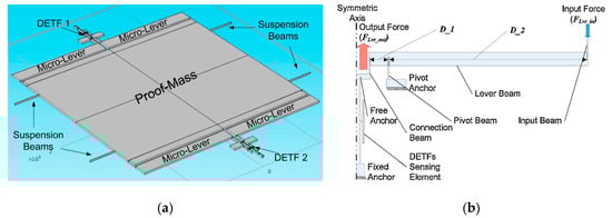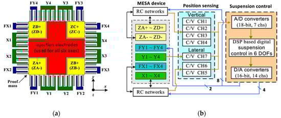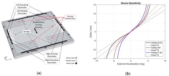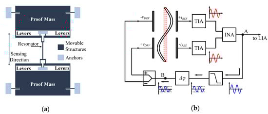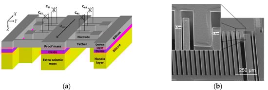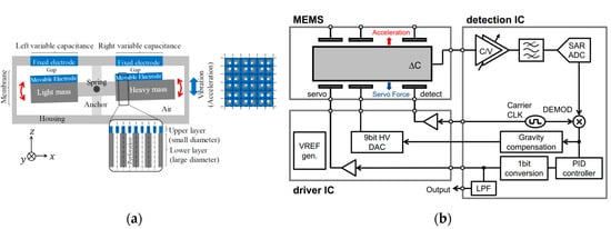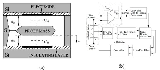 Schematic diagrams of the MEMS accelerometer and its closed-loop system developed by Aaltonen et al. at Helsinki University of Technology [,]: (a) schematic of the MEMS accelerometer; (b) block diagram of the closed-loop control system.