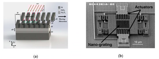 - Wang, C.; Lu, Q.; Bai, J.; Yang, G.; Wang, K.; Liu, N.; Yang, Y. Highly sensitive lateral deformable optical MEMS displacement sensor: Anomalous diffraction studied by rigorous coupled-wave analysis. Appl. Opt. 2015, 54, 8935–8943. [Google Scholar] [CrossRef]