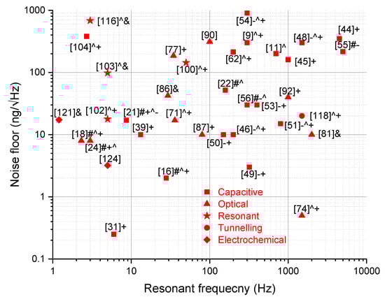 Zhang et al. [] (2019) at Xi’an Jiaotong University and Changan University developed a MEMS accelerometer with anti-spring structures with a noise floor of 52 ng/√Hz (at 1 Hz) within a bandwidth of 158 Hz. The anti-spring structures were pre-loaded through electrostatic force produced by capacitive comb fingers.