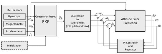 The method considered in this study was based on the error prediction filter, which uses the output of AHRS algorithm inspired by proposed EKF-based method proposed by the authors of []. The mentioned AHRS algorithm was chosen due to its adaptability, precision, and time-varying noise covariance. The main objective of the proposed method was to improve the accuracy of the AHRS algorithms. Also, the designed filter can work with all kinds of orientation estimation methods. The attitude error prediction filter are described in Section 3.1, and the PI controller and regulator are described in Section 3.2.