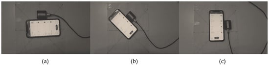 Three experiments were performed to validate the proposed method in static mode, and today’s orientation determination technology of smartphones were considered as true attitude references. We selected a smartphone as an orientation reference because of their accessibility, MATLAB and Simulink compatibility, and precise orientation estimation in static mode []. The iPhone 11 and Samsung S10 were chosen for comparison. These tests were performed on a table in which the main degrees and the true north were marked as −135, −90, −45, 0, 45, 90, 135, and 180 (see Figure 3). The zero degree for the heading test was fixed to the true navigation north. To compare the selected smartphones, three special trajectories were followed by locating both smartphones at the same time in each marked angle to obtain their angle error in static mode. Each trajectory was designed for one of the channels, and the complete experimental test was performed in three different scenarios for each angle. The results of root mean square error (RMSE) for the attitude determiner of each smartphone are shown in Table 1.