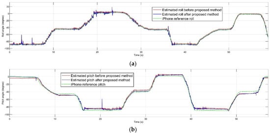 Estimated attitude before and after proposed method compared to the iPhone reference: (a) roll; (b) pitch.