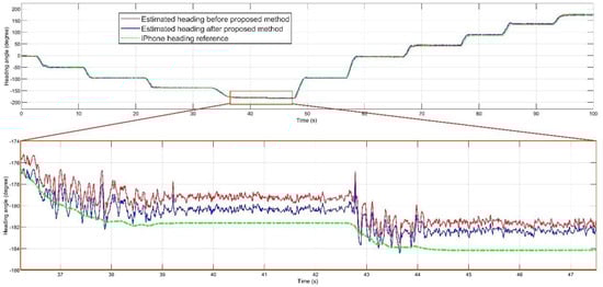 Estimated heading, before and after proposed method compared to the iPhone reference.