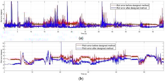 Absolute attitude error before and after performing the method for each orientation channel: (a) roll; (b) pitch; (c) heading.
