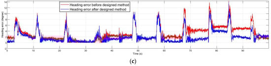 Figure 9 illustrates the absolute orientation error before and after the error prediction method. The proposed algorithm had the most significant effect on the heading error, and the error in roll and pitch was decreased. Figure 10 demonstrates that the attitude error prediction filter proposed in this paper could estimate the orientation error. The prediction signal for each channel was obtained after the PI controller and regulation.