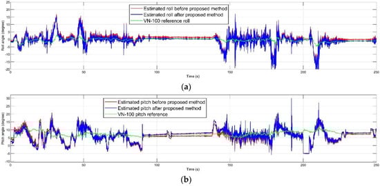 The mentioned dynamic accuracy experiment was performed in 250 s. The inertial and magnetic data of the MPU-9250 and the AHRS reference data of VN-100 board were recorded during the experimental path. The experiment’s route was selected according to smooth inclination. Figure 8 demonstrates the attitude estimation before and after the proposed method compared to the true reference.